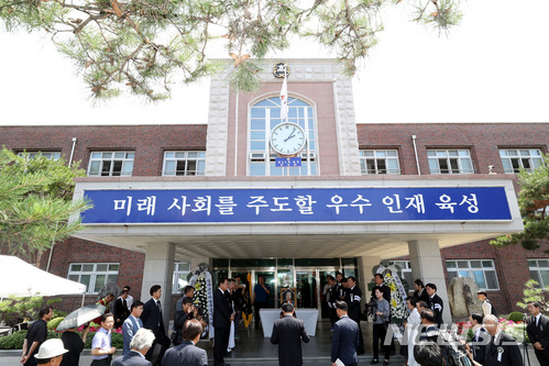 【공주=뉴시스】강종민 기자 = 27일 오후 충남 공주고등학교에서 故 김종필 전 총리의 노제가 열려 유가족과 동문, 시민들이 묵념하고 있다. 2018.06.27.