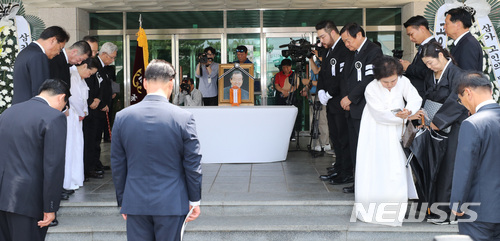 【공주=뉴시스】강종민 기자 = 27일 오후 충남 공주고등학교에서 故 김종필 전 총리의 노제가 열려 유가족과 동문, 시민들이 묵념하고 있다. 2018.06.27.