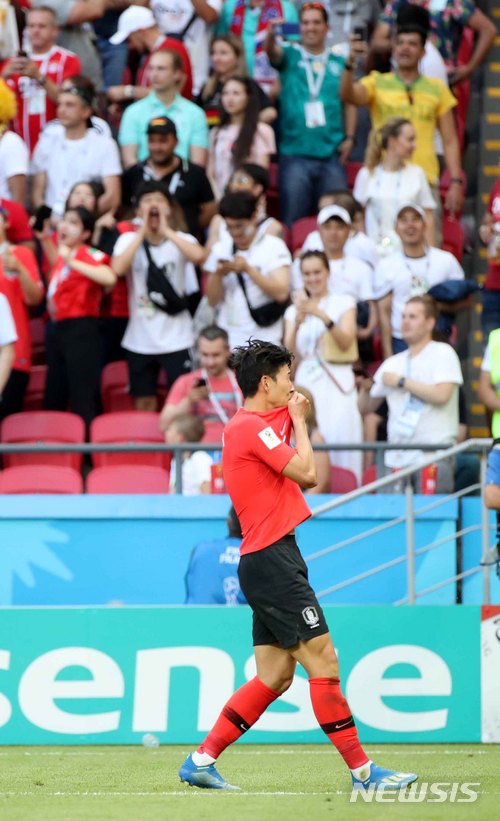 【카잔(러시아)=뉴시스】고범준 기자 = 27일(현지시간) 오후 러시아 카잔 아레나에서 열린 2018 러시아월드컵 조별리그 F조 3차전 대한민국-독일의 경기, 한국 손흥민이 후반 두번째 골을 넣고 기뻐하고 있다. 2018.06.28.