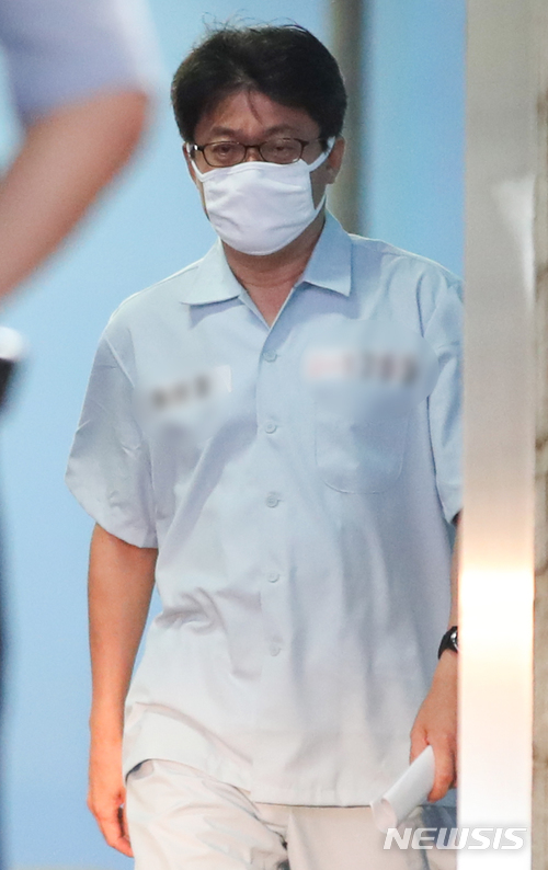 【서울=뉴시스】김선웅 기자 = 이명박 정부 시절 국정원 특활비를 불법 수수한 혐의로 구속 기소돼 1심에서 징역 1년과 집행유예 2년을 선고받은 김진모 전 청와대 민정2비서관이 28일 오후 서울 서초구 서울중앙지법을 나서고 있다. 2018.06.28.