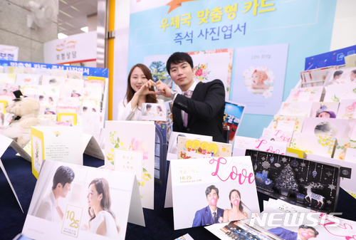 29일 오전 서울 광화문우체국에서 직원들이 웨딩사진을 넣은 청첩장과 즉석사진엽서를 소개하고 있다. 2018.06.29.