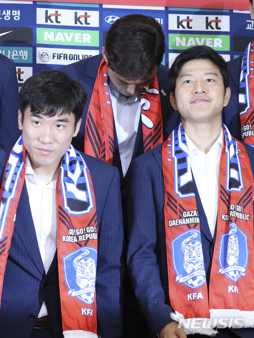 【인천공항=뉴시스】최진석 기자 = 2018 러시아월드컵 대한민국 축구대표팀 장현수(가운데)가 29일 인천국제공항 제2여객터미널을 통해 귀국해, 고개숙여 인사하고 있다.