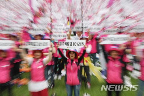 【서울=뉴시스】김진아 기자 = 전국학교비정규직노동조합 조합원들이 30일 오후 서울 중구 서울광장에서 열린 ‘630 학교비정규직노동자 총궐기대회’에서 최저임금 개악법 폐기, 정규직 임금의 80% 쟁취, 비정규직 완전철폐를 촉구하며 구호를 외치고 있다. 2018.06.30.