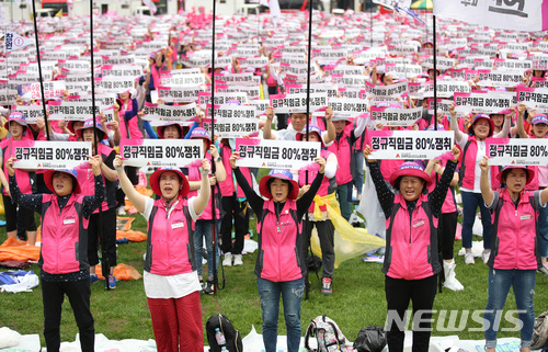 【서울=뉴시스】김진아 기자 = 전국학교비정규직노동조합 조합원들이 30일 오후 서울 중구 서울광장에서 열린 ‘630 학교비정규직노동자 총궐기대회’에서 최저임금 개악법 폐기, 정규직 임금의 80% 쟁취, 비정규직 완전철폐를 촉구하며 구호를 외치고 있다. 2018.06.30.