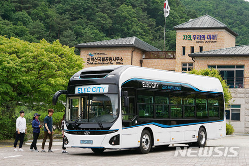전국 4개 국립공원에서 1달간씩 순차적으로 관광객 셔틀버스로 시범 운영되는 현대자동차 친환경 전기버스 ‘일렉시티’의 모습 2018.07.01. (사진=현대차 제공)