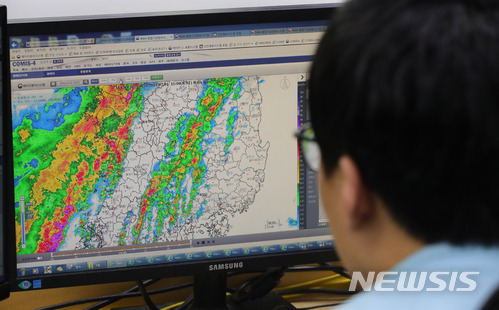 【서울=뉴시스】배훈식 기자 = 장마와 제7호 태풍 쁘라삐룬(PRAPIROON)의 영향으로 전국에 많은 비가 내린 1일 오전 서울 동작구 기상청에서 한 직원이 전국 강수량을 모니터링 하고 있다. 2018.07.01.