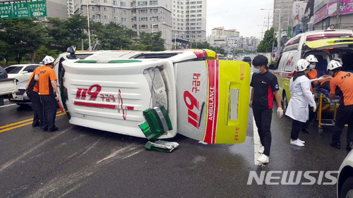 【광주=뉴시스】신대희 기자 = 2일 오전 10시55분께 광주 북구 운암동 한 아파트 앞 교차로에서 스타렉스 승합차가 최모(38) 구급대원이 몰던 구급차 옆쪽을 들이받았다. 이 사고로 구급차에 타고 있던 이송환자, 구급대원 등 5명이 경상을 입었다. 2018.07.02. (사진 = 광주 북부경찰서 제공)