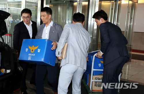 【서울=뉴시스】전진환 기자 = 경찰이 2일 이재환 CJ파워캐스트 대표가 회삿돈을 빼돌린 정황을 포착하고 경기도 성남 본사와 서울 대치동 강남지사 등을 압수수색 했다. 서울 대치동 강남지사 압수수색을 마친 경찰이 압수품을 차량에 싣고 있다.