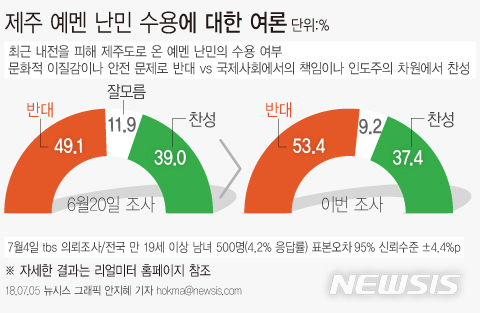 [그래픽]제주 예멘 난민 수용, 반대 53% vs 찬성 37% (리얼미터)