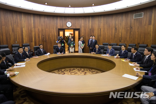 【평양=뉴시스】 사진공동취재단 = 노태강 문체부 차관과 남측 관계자들이 5일 오후 평양 고려호텔을 찾아온 북측 원길우 체육상 부상 일행과 체육실무회담을 하고 있다. 2018.07.06.