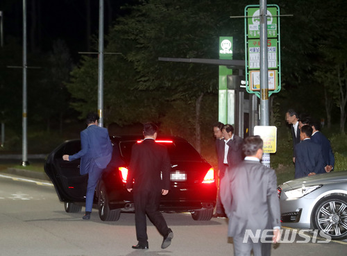 【서울=뉴시스】임태훈 기자 = 수백억 원대 상속세 탈루 등 비리 의혹을 받고 있는 조양호 한진그룹 회장의 영장이 기각된 6일 오전 서울 구로구 남부구치소 앞에서 조원태 대한항공 대표이사 사장이 조회장의 차량에 함께 탑승하고 있다. 2018.07.06.