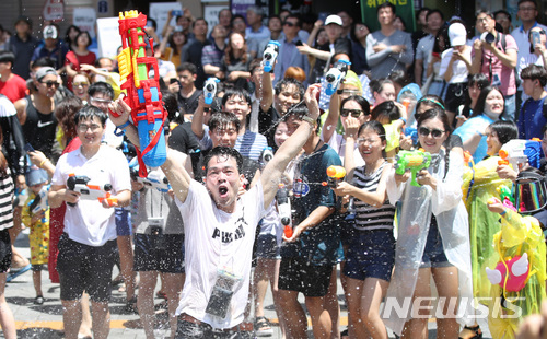 【서울=뉴시스】김진아 기자 = 7일 오후 서울 서대문구 연세로에서 열린 '제6회 신촌물총축제'에서 시민들이 물총싸움을 하고 있다. 이번 축제는 ‘로봇(안드로이드)과 인간의 한판 물총 대결’이라는 콘셉트로 진행됐다. 2018.07.07.