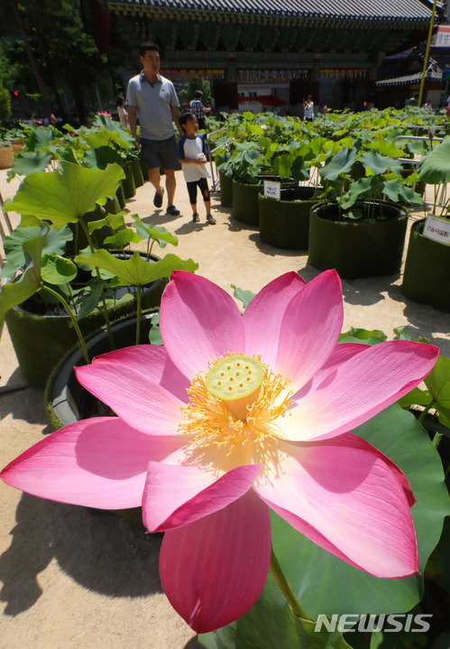 【서울=뉴시스】배훈식 기자 = 제4회 조계사 연꽃축제가 열린 8일 오전 서울 종로구 대한불교 조계종 조계사 마당에 탐스러운 연꽃이 피어있다. 2018.07.08.