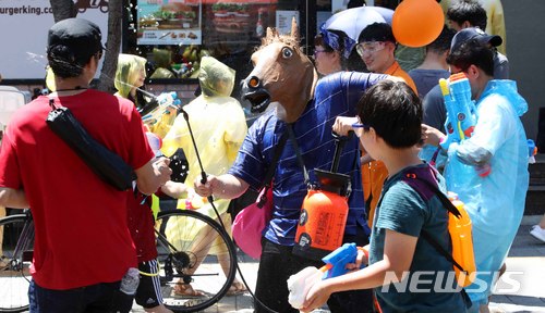 【서울=뉴시스】고범준 기자 = 8일 오후 서울 서대문구 신촌 연세로 일대에서 열린 '제6회 신촌물총축제'에서 말 가면을 쓴 시민이 물총싸움을 하고 있다. 2018.07.08.