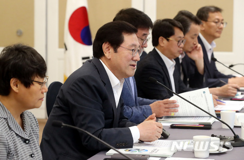 【서울=뉴시스】박영태 기자 = 12일 오전 서울 영등포구 여의도 국회에서 진행된 광주시-광주지역국회의원 예산정책간담회에서 이용섭 광주광역시장이 인사말을 하고 있다. 2018.07.12.