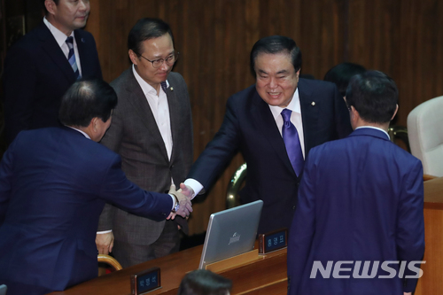 【서울=뉴시스】고승민 기자 = 13일 오전 서울 여의도 국회에서 20대 후반기 국회를 이끌어갈 의장단 선출을 위해 열린 본회의에서 의장으로 공식 선출된 더불어민주당 문희상 의원이 동료 의원들에게 축하를 받고 있다. 2018.07.13.