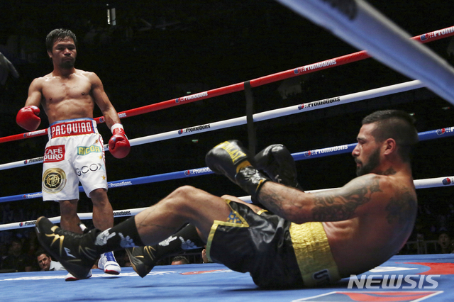 【쿠알라룸푸르=AP/뉴시스】 매니 파퀴아오(40·필리핀)가 15일(한국시간) 말레이시아 쿠알라룸푸르에서 세계복싱협회(WBA) 웰터급 타이틀매치 루카스 마티세(36·아르헨티나)와의 경기에서 7회 TKO 승을 거뒀다.