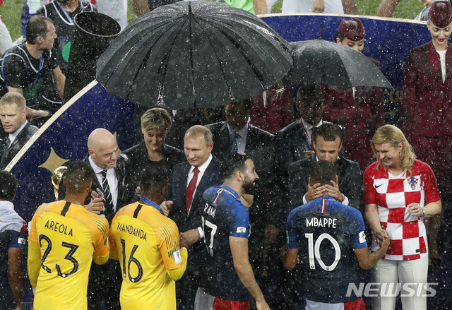 【모스크바 = AP/뉴시스】 15일 비가 내리는 경기장에서 월드컵 결승전에서 승리한 프랑스 선수들에게 축하의 인사를 하고 있는 지아니 인판티노 FIFA회장(맨 왼쪽)과 푸틴 러시아대통령, 마크롱 프랑스 대통령, 콜린다 그라바르-키타로비치 크로아티아 대통령. 2018.07.16