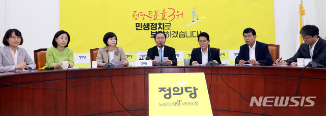 【서울=뉴시스】박영태 기자 = 17일 오전 서울 영등포구 여의도 국회에서 진행된 정의당 의원총회에서 노회찬 원내대표가 발언을 하고 있다. 2018.07.17.