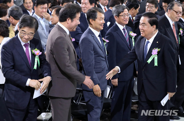 【서울=뉴시스】홍효식 기자 = 17일 오전 서울 여의도 국회 본청 로텐더홀에서 열린 제70주년 제헌절 경축식에서 문희상 국회의장과 이낙연 국무총리가 악수하고 있다. 왼쪽부터 권순일 중앙선거관리위원장, 이낙연 국무총리, 이진성 헌법재판소장, 김명수 대법원장, 문희상 국회의장. 2018.07.17.