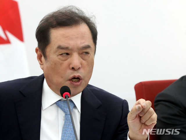 【서울=뉴시스】박영태 기자 = 18일 오전 서울 영등포구 여의도 국회 자유한국당 당대표실에서 진행된 김병준 혁신 비상대책위원장 기자간담회에서 김 비대위원장이 취재진의 질문에 대답하고 있다. 2018.07.18.