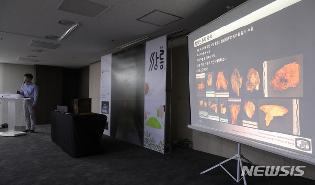【서울=뉴시스】조수정 기자 = 익산 쌍릉 대왕릉 출토 인골 분석 결과 공개 기자설명회가 열린 18일 오전 서울 종로구 국립고궁박물관에서 이우영 카톨릭의대 교수가 출토 인골에 대한 법의인류학적 분석 결과 등을 발표하고 있다.