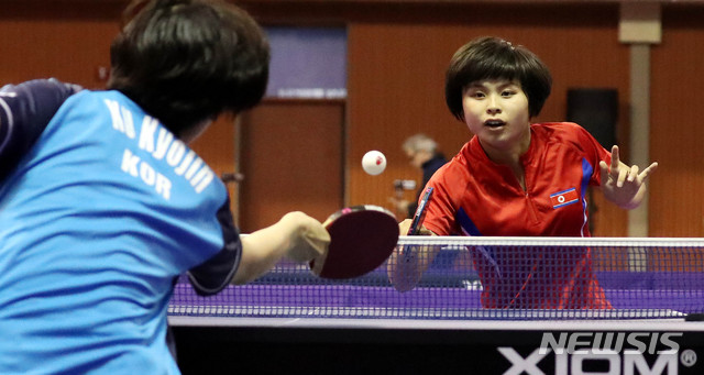 【대전=뉴시스】추상철 기자 = 2018 코리아오픈 탁구대회가 열린 18일 오후 대전 한밭체육관에서  여자단식 예선에 출전한 한국 구교진과 북한 편송경이 경기를 펼치고 있다. 2018.07.18.