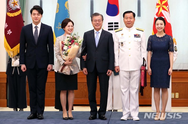 왼쪽부터 아들 심민재, 부인 이경숙, 문 대통령, 심 참모총장, 딸 심수연. 2018.07.19.