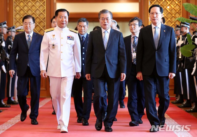 【서울=뉴시스】박진희 기자 = 문재인 대통령이 19일 오전 청와대 충무실에서 심승섭 해군참모총장 진급 및 보직 신고를 마치고 환담장으로 이동하고 있다.