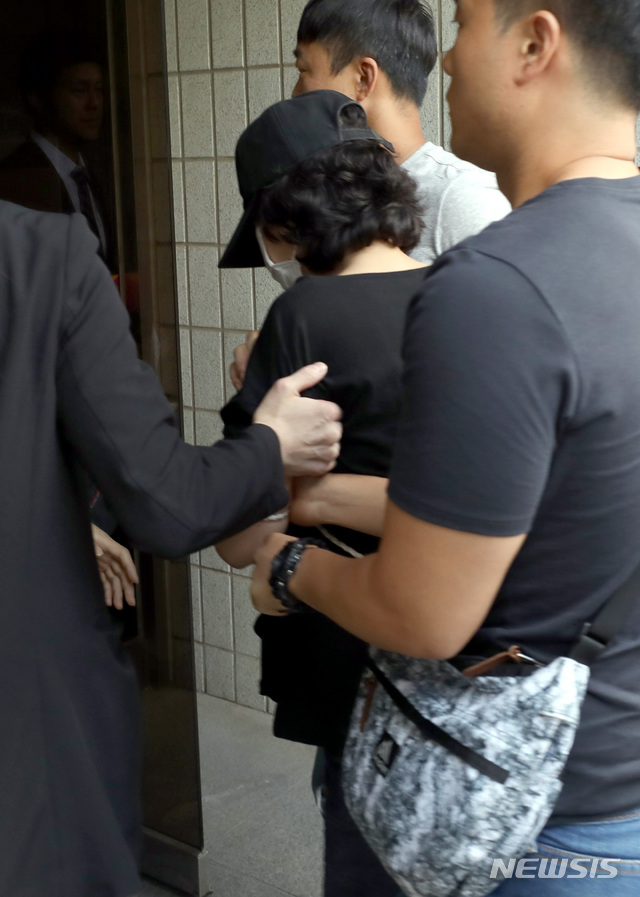 【서울=뉴시스】전진환 기자 = 생후 11개월 된 영아에게 이불을 덮고 짓눌러 사망하게 한 혐의(아동학대 치사)로 긴급체포된 어린이집 보육교사 김모 씨가 20일 오전 영장실질 심사를 받기 위해 서울 양천구 서울남부지방법원으로 들어가고 있다. 2018.07.20