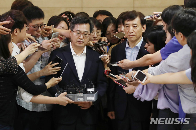 【서울=뉴시스】김진아 기자 = 김동연 부총리 겸 기획재정부 장관과 이주열 한국은행 총재가 16일 서울 중구 한국은행에서 최근 경제·금융 현안과 대응방향을 논의를 위한 조찬 회동 후 브리핑을 하고 있다. 2018.07.21.