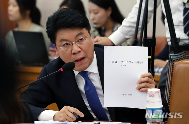 【서울=뉴시스】홍효식 기자 = 자유한국당 장제원 의원이 20일 오전 서울 여의도 국회 본청 법제사법위원회 회의실에서 열린 전체회의에 참석해 국군기무사령부의 '전시 계엄 및 합수업무 수행방안' 보고서를 들어보이며 질의하고 있다. 2018.07.20.