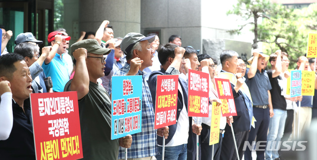 【서울=뉴시스】전진환 기자 = 제123차 국립공원위원회의 흑산도 신공항 건설사업 심의 결과 발표가 예정된 20일 오후 서울 마포구 국립공원 관리공단 앞에서 흑산도 주민들이 신공항 건설 조기 착공 결의대회를 하고 있다. 2018.07.20