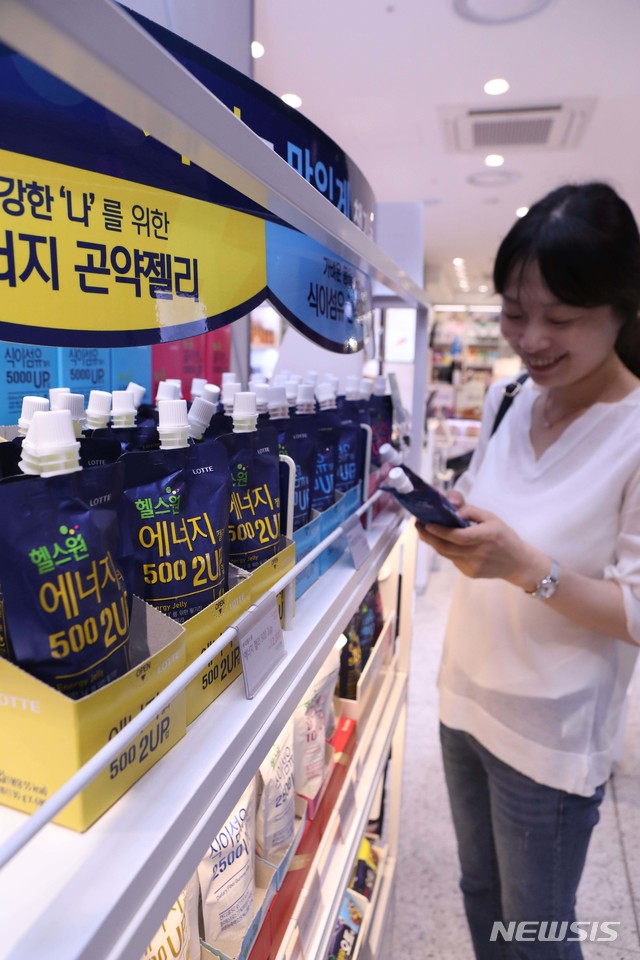【서울=뉴시스】 20일 서울 롯데백화점 잠실점에서 고객들이 헬스원 곤약젤리 상품을 보고 있다.