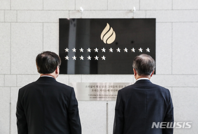 【서울=뉴시스】전신 기자 = 문재인 대통령이 20일 국정원 청사에 설치된 '이름없는 별' 석판 앞에서 서훈 국정원장과 함께 바라보고 있다. 2018.07.20. (사진=청와대 제공)