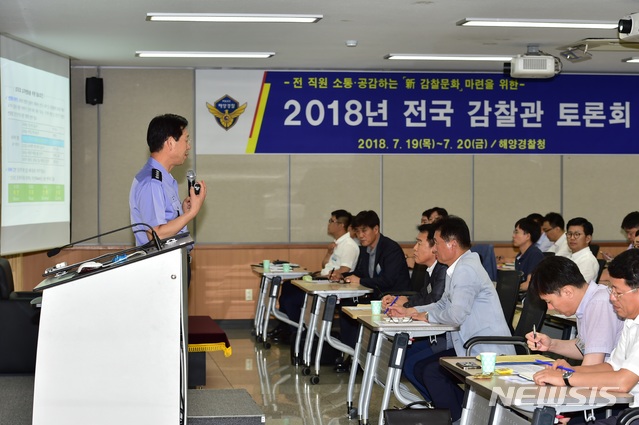 【서울=뉴시스】박주성 기자 = 조현배 해양경찰청장은 20일 오전 천안 해양경찰연구센터에서 신 감찰 문화 마련을 위한 전국 감찰관 토론회 특강을 통해 “자기주도적 업무수행으로 존중, 정의, 소통, 공감이 묻어나는 문화를 정착시킬 것”을 당부하였다. 2018.07.20. (사진=해양경찰청 제공)