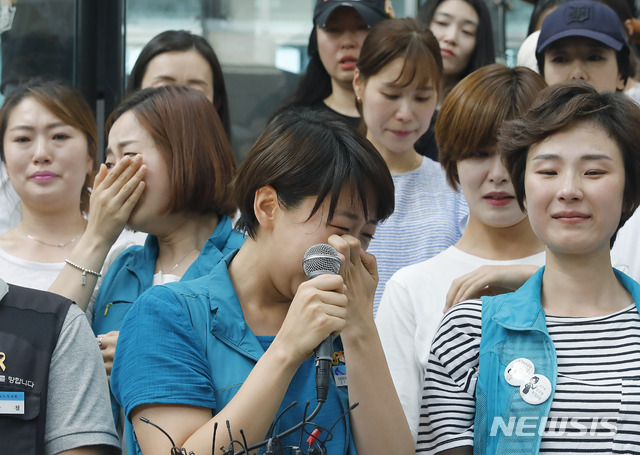 【서울=뉴시스】최동준 기자 = 철도 노사가 KTX 해고 승무원 복직에 합의한 21일 서울 용산구 서울역에서 해고 승무원들이 기자회견 중 눈물을 흘리고 있다. 2018.07.21.