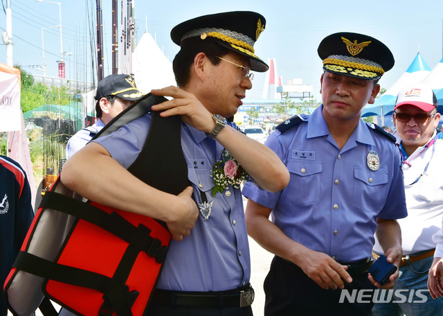 【서울=뉴시스】최동준 기자 = 조현배 해양경찰청장이 21일 인천 옹진군 영흥도에서 열린 제1회 해양경찰청장배 바다낚시대회에 참석해 구명조끼를 입으며 해양 안전을 강조하고 있다. 2018.07.21. (사진=해양경찰청 제공)