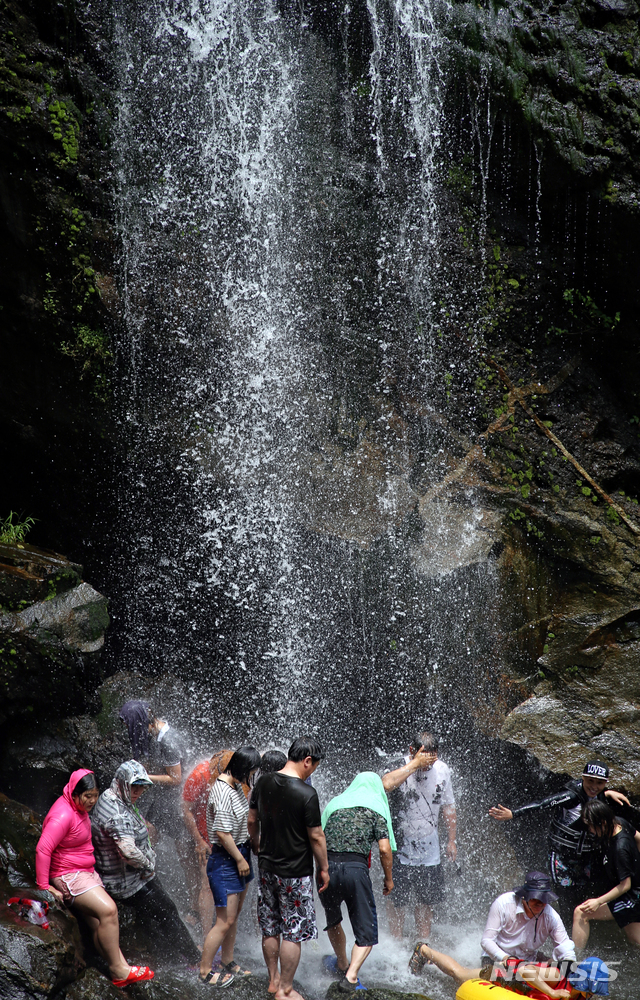 【구례=뉴시스】류형근 기자 = 무더위가 지속되고 있는 21일 오후 전남 구례군 산동면 수락폭포에서 피서객들이 물줄기를 맞으며 더위를 식히고 있다. 2018.07.21. (사진= 전남 구례군청 제공)