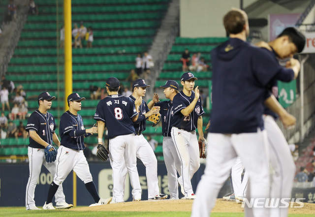【서울=뉴시스】김진아 기자 = 22일 서울 잠실야구장에서 열린 2018 KBO 리그  두산 베어스와 LG 트윈스의 경기, 6대1로 승리한 두산 선수들이 기뻐하고 있다. 2018.07.22.