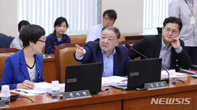 【서울=뉴시스】고승민 기자 = 24일 오전 서울 여의도 국회에서 민갑룡 경찰청장 후보자 인사청문 경과보고서 채택 등을 안건으로 열린 제3차 행정안전위원회에서 채택 시기를 놓고 여야 갈등이 빚어진 가운데 더불어민주당 강창일 의원이 자신의 발언 도중 이를 가로막은 대한애국당 조원진 의원에게 호통치고 있다. 2018.07.24.