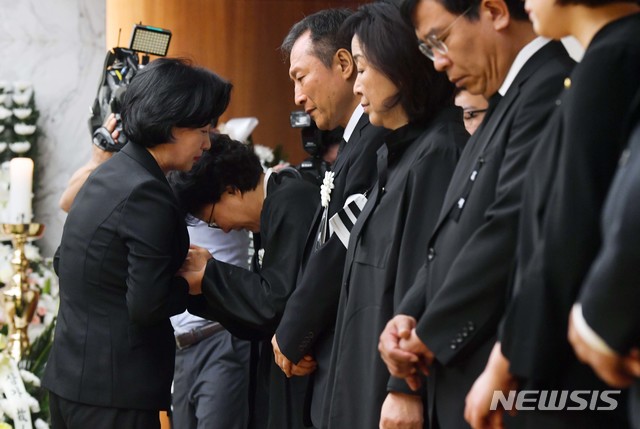 【서울=뉴시스】사진공동취재단 = 추미애 더불어민주당 대표가 24일 오전 서울 서대문구 신촌 세브란스병원 장례식장에 마련된 고 노회찬 정의당 원내대표의 빈소를 찾아 부인 김지선 씨를 위로하고 있다. 2018.07.24.