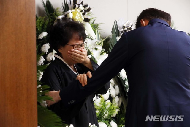 【서울=뉴시스】사진공동취재단 = 조국 청와대 민정수석이 24일 오후 서울 서대문구 신촌 세브란스 병원 장례식장에 마련된 고 노회찬 정의당 원내대표의 빈소를 찾아 조문한 뒤 고인의 부인 김지선씨와 오열하고 있다. 2018.07.24.