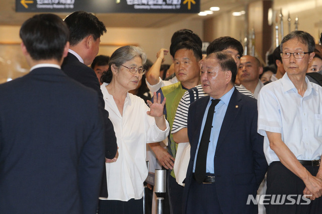 【서울=뉴시스】사진공동취재단 = 24일 오후 서울 서대문구 연세대 세브란스병원 장례식장에 마련된 고 노회찬 정의당 원내대표의 빈소를 찾은 강창일 더불어민주당 의원이 조문하기 위해 이동하고 있다. 2018.07.24.