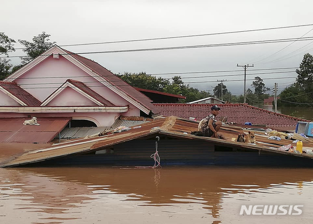 【아타프=AP/뉴시스】라오스 남동부 아타프 주에서 24일 한 남성이 전날 세피안-세남노이 수력발전 댐이 붕괴해 홍수가 발생하자 지붕 위에 올라가 구조를 기다리고 있다. 사진은 현지방송 아타프TV 동영상을 캡처한 것이다. 2018.07.25