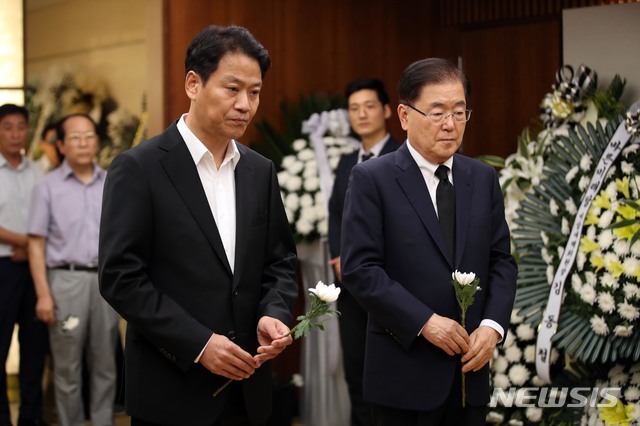 【서울=뉴시스】김선웅 기자 = 임종석 비서실장과 정의용 국가안보실장이 25일 오전 서울 서대문구 신촌세브란스병원 장례식장에 마련된 故 노회찬 정의당 원내대표의 빈소를 찾아 조문하고 있다. 2018.07.25.