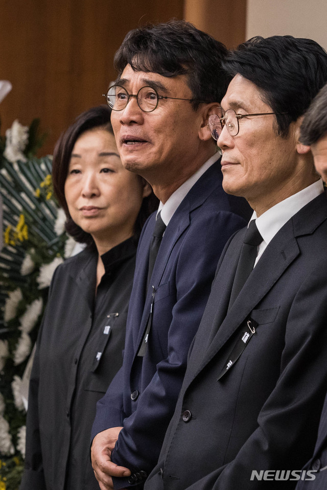 【서울=뉴시스】최동준 기자 = 유시민 작가, 심상정 의원이 25일 오후 서울 서대문구 신촌 세브란스병원 장례식장에 마련된 고 노회찬 정의당 원내대표의 빈소에서 조문객들을 맞이하고 있다. 2018.07.24.