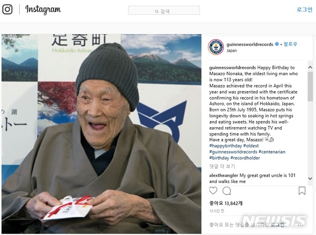 【서울=뉴시스】 세계기네스협회는 25일(현지시간) 인스타그램을 통해 생존하고 있는 세계 최고령자 노나카 마사조(野中正造)의 113번째 생일을 축하했다. <사진출처: 세계기네스협회 인스타그램> 2018.07.26