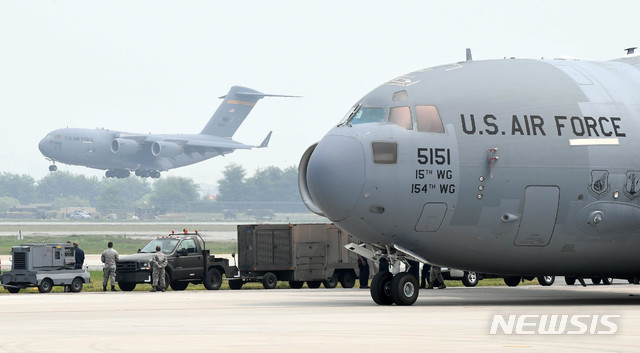 【평택=뉴시스】사진공동취재단 = 정전협정 체결 65주년을 맞은 27일 한국전쟁 중 북측에서 사망한 미군의 유해를 싣은 미공군 수송기가 북한 원산 갈마비행장에서 경기도 평택 오산공군기지로 도착하고 있다.