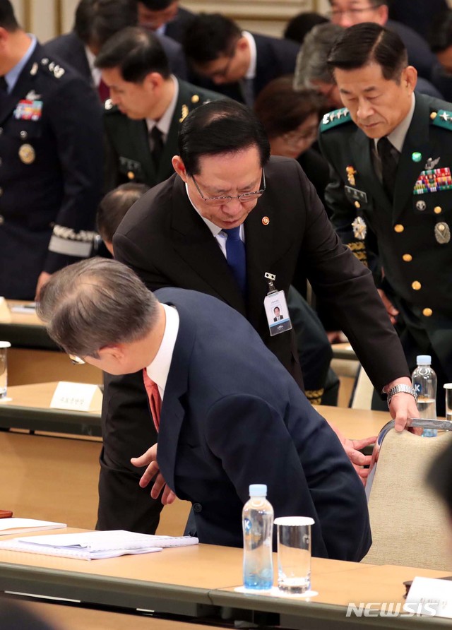 【서울=뉴시스】박진희 기자 = 문재인 대통령이 27일 청와대 영빈관에서 열린 전군 주요 지휘관 회의 국방개혁2.0 보고대회에 참석한 가운데 송영무 국방부 장관이 문 대통령의 착석을 도와주고 있다. 2018.07.27.